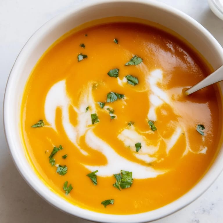 - Ladle into warmed bowls and top with fresh herbs and that optional swirl of coconut cream or yogurt. Watch how the green and white play against that brilliant orange.
