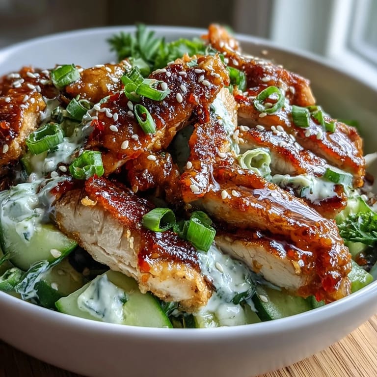 The temperature contrast is actually the reason this bowl works so well. Warm chicken against cool, creamy cucumber salad creates this satisfying moment where your mouth experiences multiple sensations at once. The chili crisp bridges everything by being spicy enough to cut through the creaminess while staying bright rather than heavy. I've learned that this balance is what keeps people coming back to the same bowl format over and over.