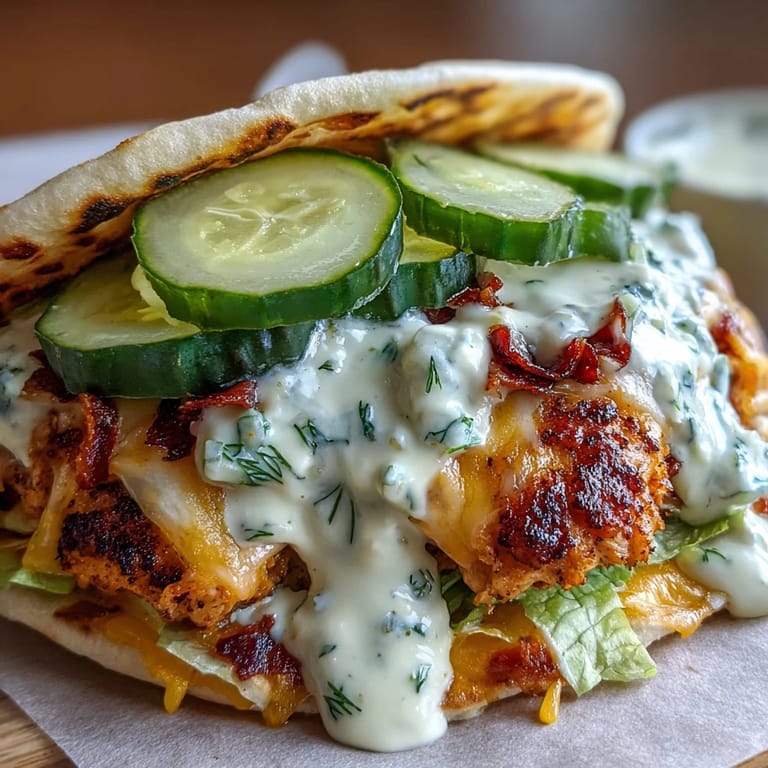 - Spread that homemade ranch on the cheesy side, pile on chicken, pickles, onion, and lettuce, then serve while everything is still hot and crunchy.