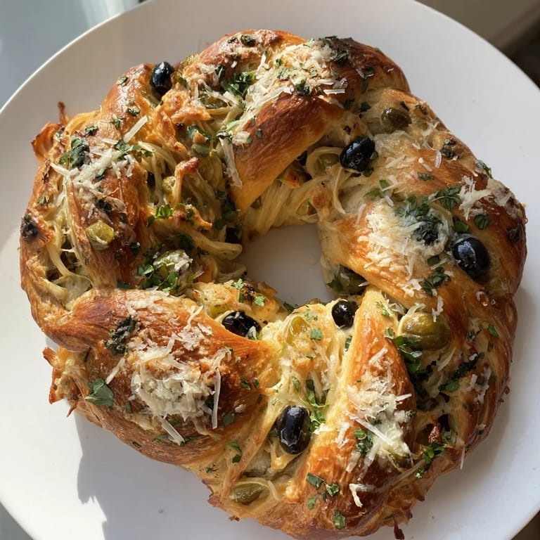 Pin this A stunning, pull-apart bread shaped like a festive wreath, bursting with fresh herbs, melty cheese, and briny olives—perfect as a centerpiece for gatherings or as an appetizer.