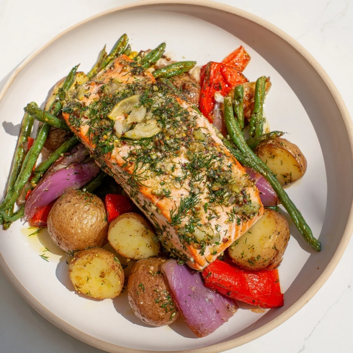 Pin this A vibrant, healthy sheet pan meal featuring tender salmon fillets, crispy roasted potatoes, and fresh seasonal vegetables, all infused with zesty lemon and aromatic herbs.