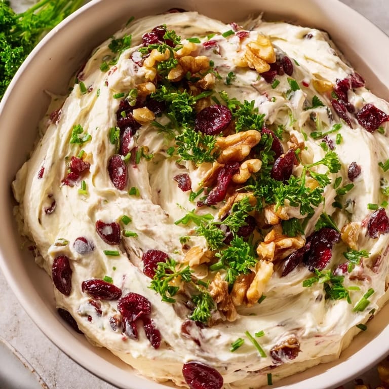 Pin this A festive, creamy dip made lighter for guilt-free holiday snacking, featuring tangy cream cheese, Greek yogurt, and bursts of cranberry and herbs.