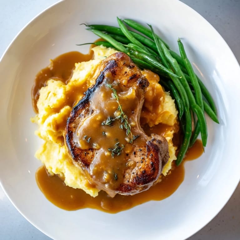 Pin this Juicy seared pork chops served atop creamy cheddar mashed potatoes, finished with a savory pan gravy and crisp green beans for a comforting, satisfying meal.