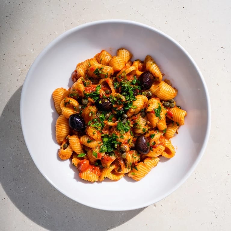 Pin this A vibrant, bold pasta dish featuring ditalini tossed in a garlicky tomato sauce with olives, capers, and anchovies for a classic southern Italian flavor.
