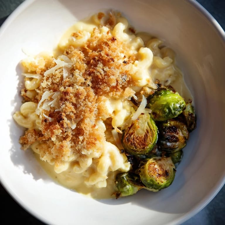 Pin this A comforting baked mac and cheese with crispy Brussels sprouts, all cooked on a single sheet pan for easy cleanup and maximum flavor.